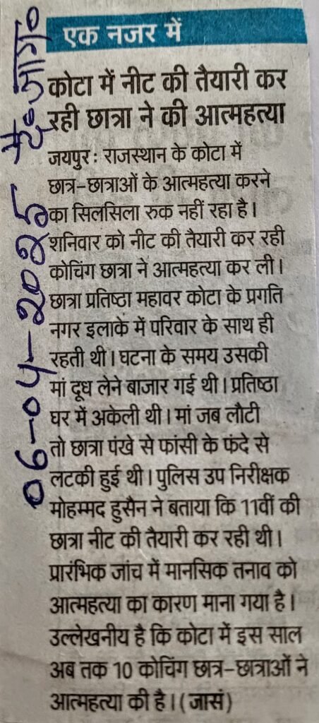 (2) Reading this news sends chills down the spine. Such news from Kota comes out almost every month. Even when children have not had good education up to high school or intermediate, their parents/guardians send them to Kota for IIT/NEET coaching/preparation. Coaching centers continuously burden children with courses and regularly test them in class. However, since their education in lower classes was weak, these children become frustrated and fall prey to depression. On the other hand, their parents/guardians frequently call to inquire about them, which makes the children feel that their parents/guardians have high expectations. As a result, they die in guilt, unable to see a way out, fall into depression, and one day, in their naivety, take an irreversible step, as mentioned in the news article. If the children’s high school/intermediate education is of high quality, they will be able to beat the J.E.E./NEET competition without going to Kota. Even if they do go to Kota, they will succeed. Even if they don’t succeed, they won’t feel as much pressure from coaching that would force them to take drastic measures.